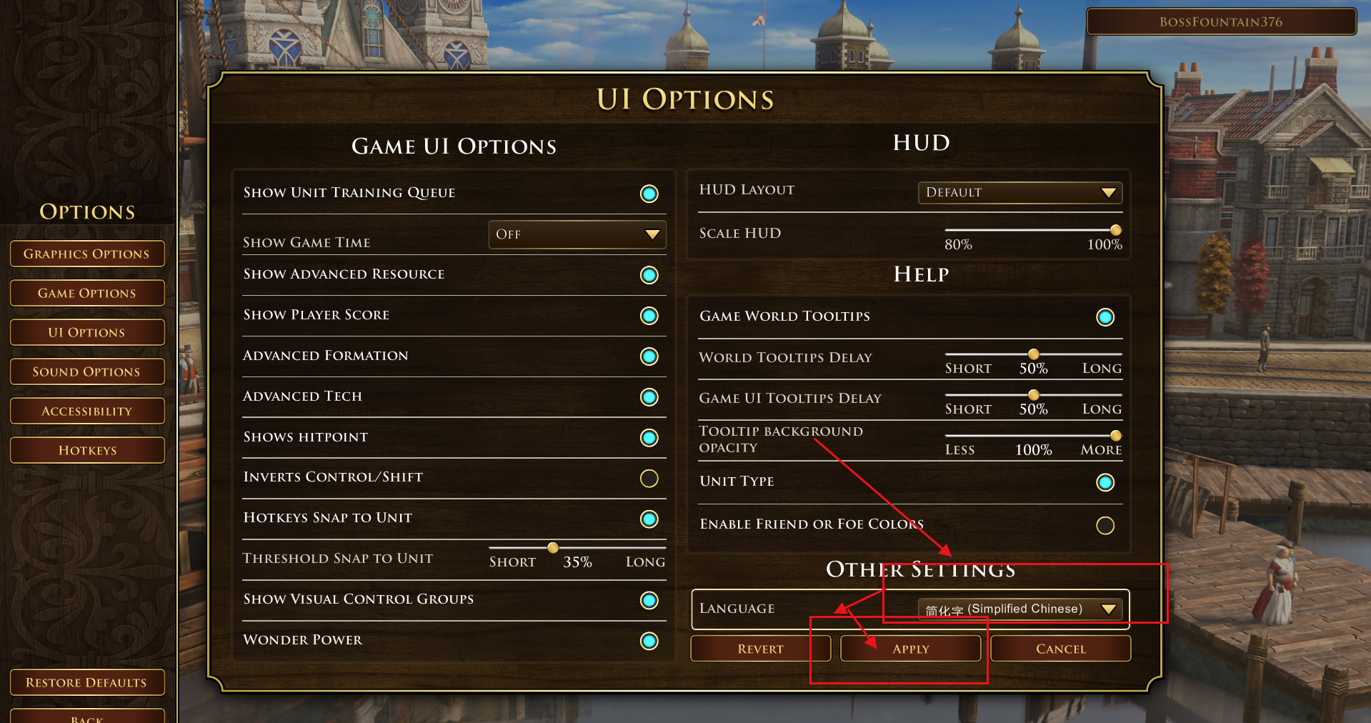 好多新手或英文不好的玩家不会改语言,这里截图教大家改