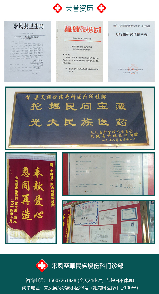 来凤白清吉烧伤科诊所: 用祖传秘方主治各种烧伤、烫伤、疤痕、经久不愈的烧伤烫伤化脓溃烂。在20多年的医疗实践中,始终坚持用中医中药治疗各种类型的烧烫伤,努力提高为人民治病的服务水平,疗效显著,且能不断更新知识、更新观念,做到继承不泥古,发扬不离宗,及时跟踪国内外医学新动态,以提高临床疗效。