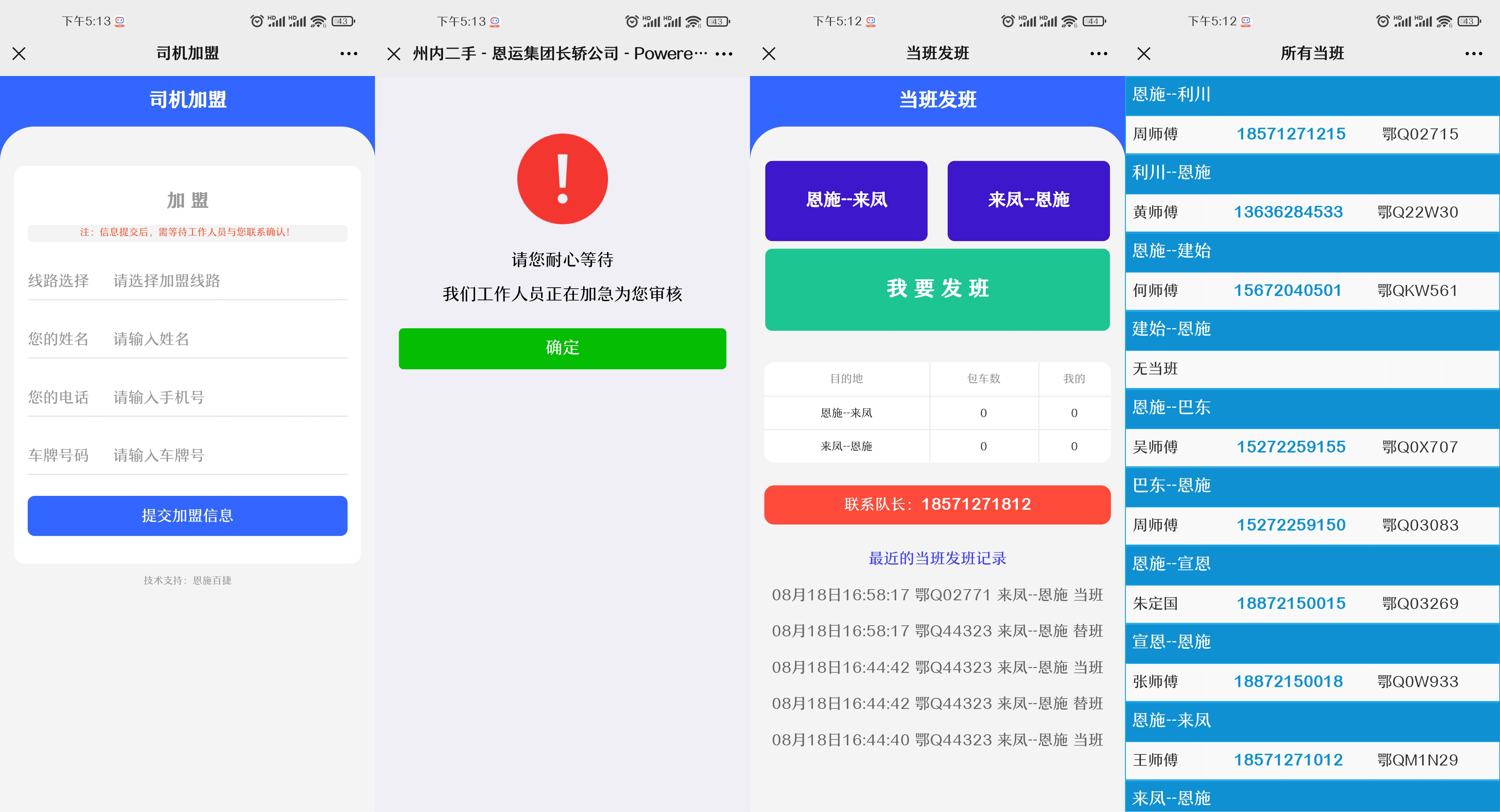 司机加盟,司机提交自己的联系方式和车牌和加盟线路,待管理员审核。