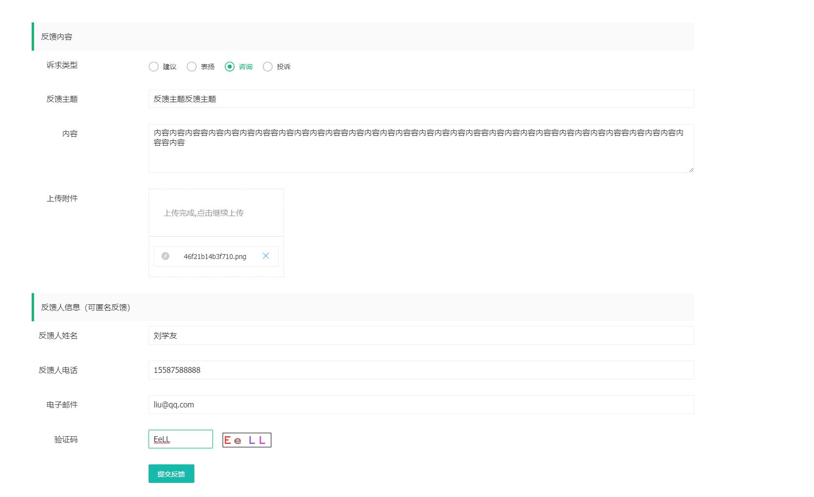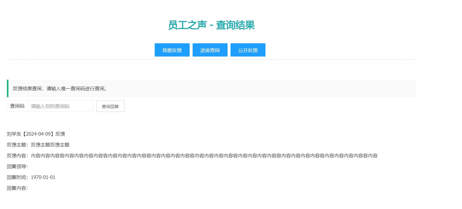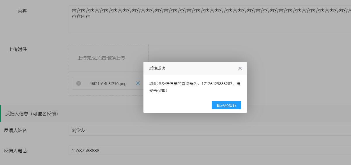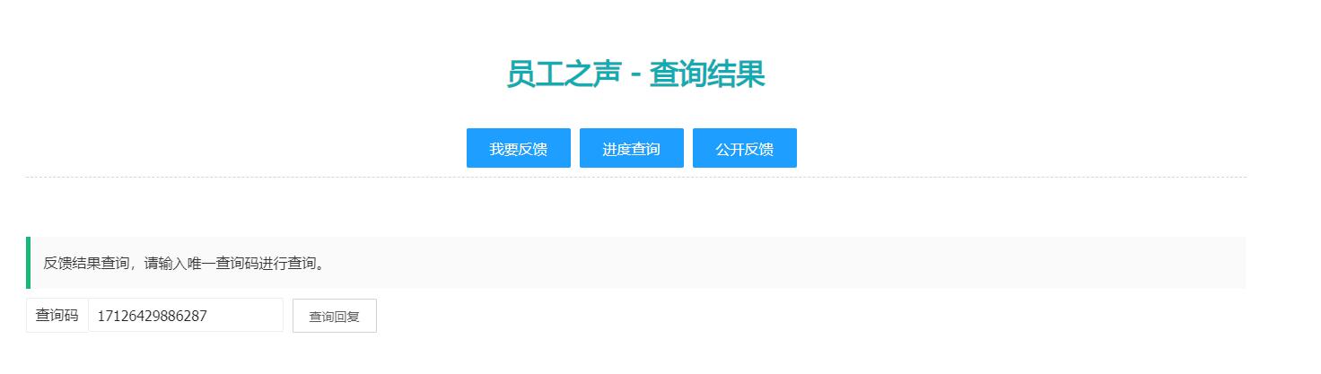 生成查询码的匿名反馈投诉系统,反馈者提交后系统自动生成一个唯一的查询码,用户可以凭查询码,查询自己的反馈处理进度,很好的保证了信息的保密又能自主查询,同时还允许上传附件,并对上传附件进行了安全处理,只有管理员才能查看上传产附件,反馈者的信息未回复或未审核上传的附件反馈者中无法访问的。