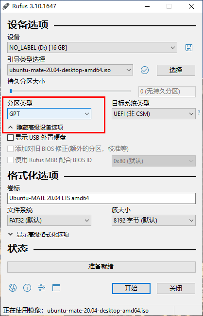 接下来我们在电脑上下载镜像刷写工具 Rufus,然后插入 U 盘,在「设备」中选择你刚刚插入的 U 盘,在「引导类型选择」中选择你刚刚下载的 Linux 系统镜像。需要说明的是,在分区类型中一定要选择「GPT」分区,目标系统类型必须是「UEFI(非 CSM)」,准备好之后选择开始。