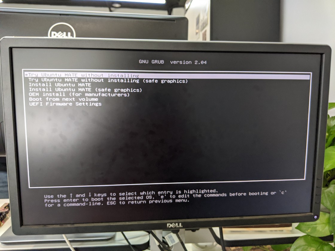 设备重启后,在 GNU GRUB 中选择第一项目(Try Ubuntu MATE without installing)然后回车进入 Ubuntu MATE Live USB 中。