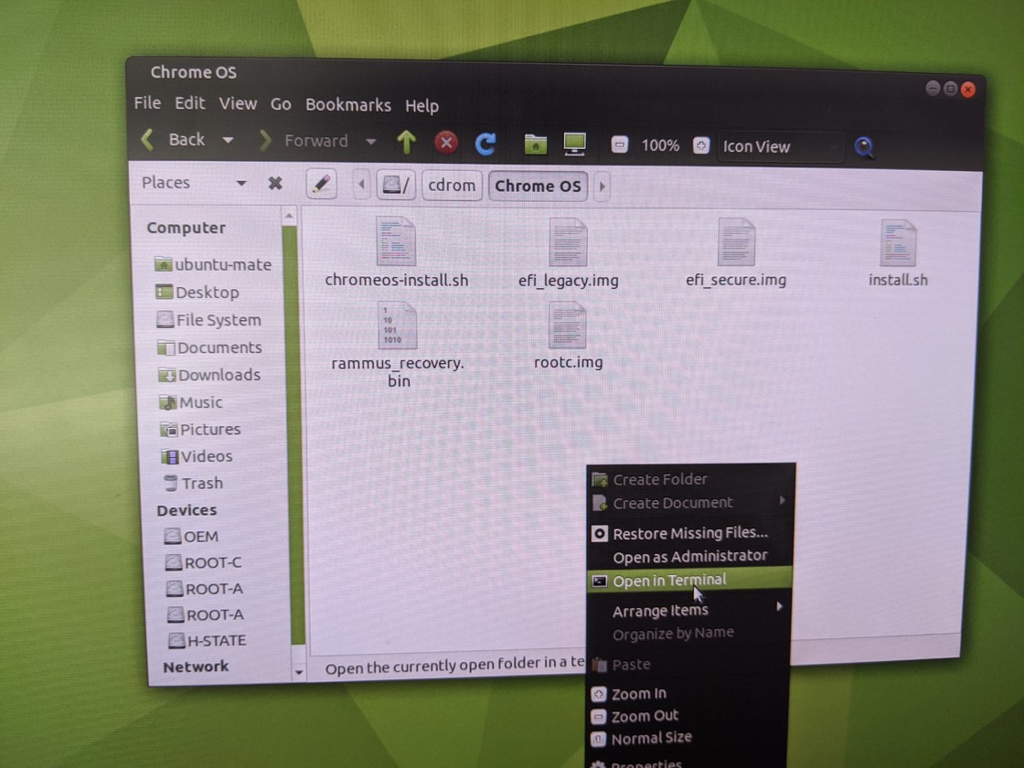 然后双击打开桌面上的文件管理器,点击左侧的File system,然后导航至/cdrom/Chrome OS,在当前目录下,右键点击选择Open in Terminal。