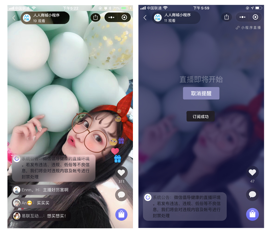 订阅提醒:开播前用户可进入直播间点击“开播提醒”进行订阅,直播开始后用户将收到一条模板消息提醒;