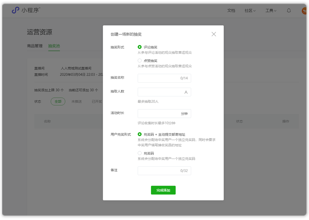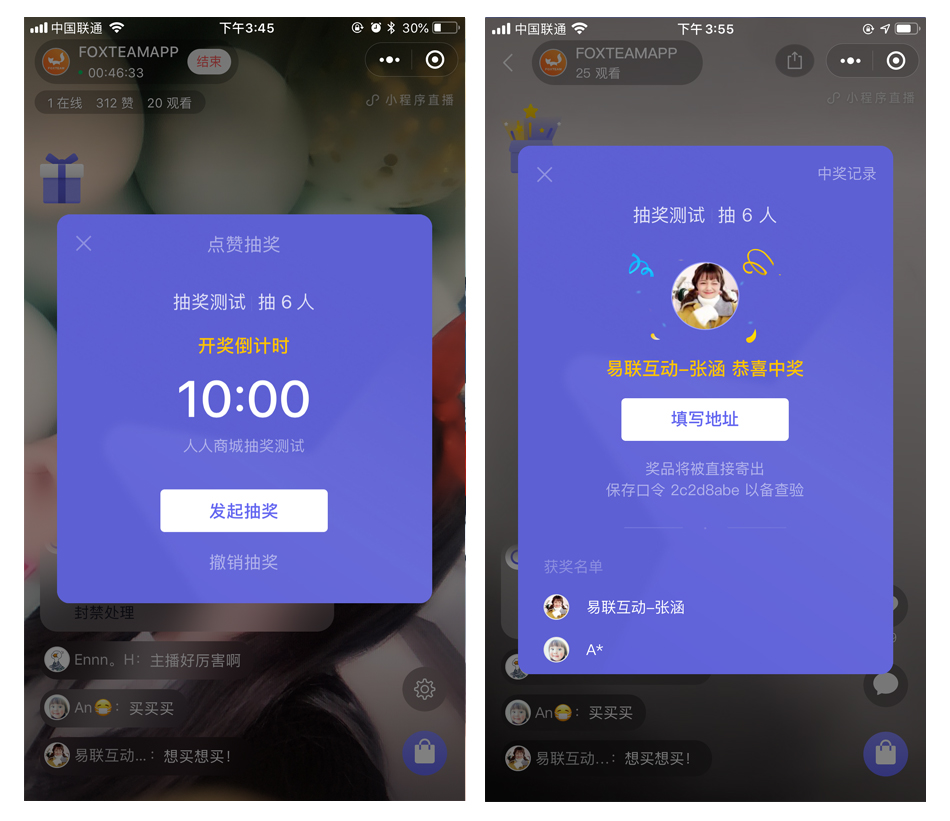 营销功能-抽奖:后台可设置评论抽奖和点赞抽奖两种方式,主播点击抽奖过程中,评论或点赞的用户可以参与抽奖,中奖用户凭借获得的唯一兑奖码进行奖品兑换。商家可在后台获取用户信息,操作便捷体验流畅。