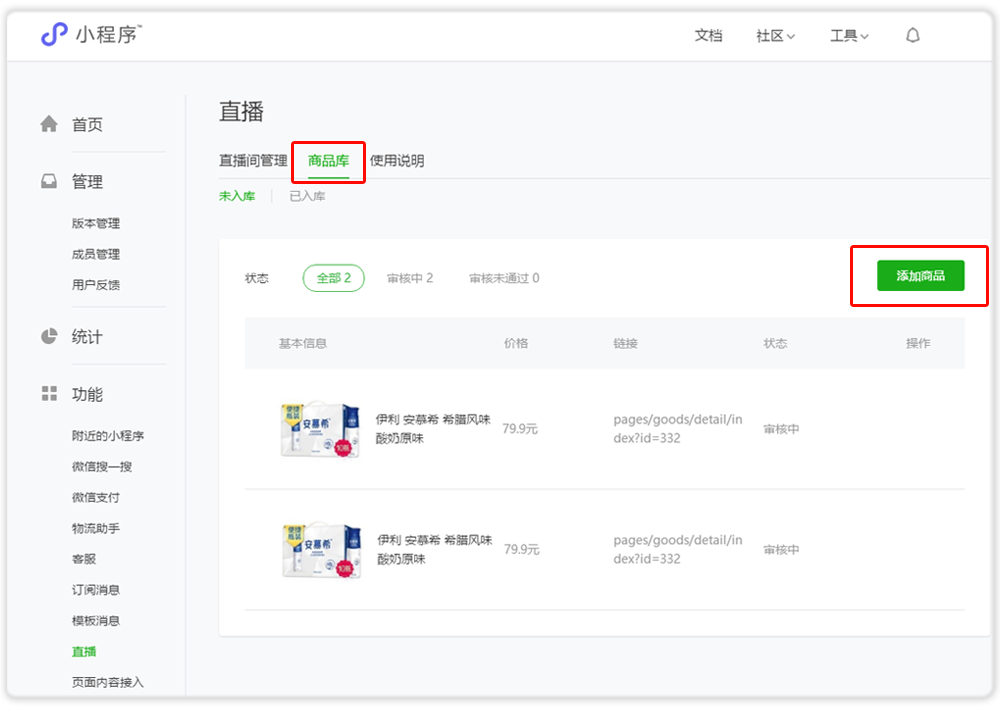 添加商品:商家提交商品审核完成商品入库。创建直播间后导入商品库的商品。(商品需经审核,时长为1~7天,入库商品上限为2000件,直播间商品上限200件。)