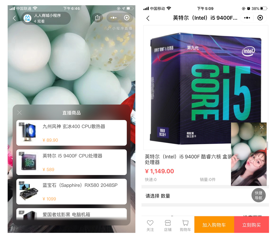 商品购买:直播页面提供购物车按钮,观众点击可直接进入商品详情页,完成小程序直接购买。通过直播转至详情页时,直播仍将以浮窗形式出现,便于用户随时返回直播间。