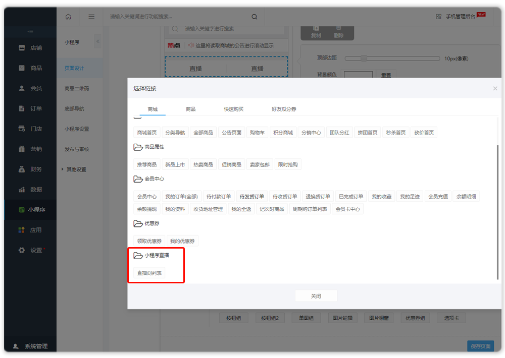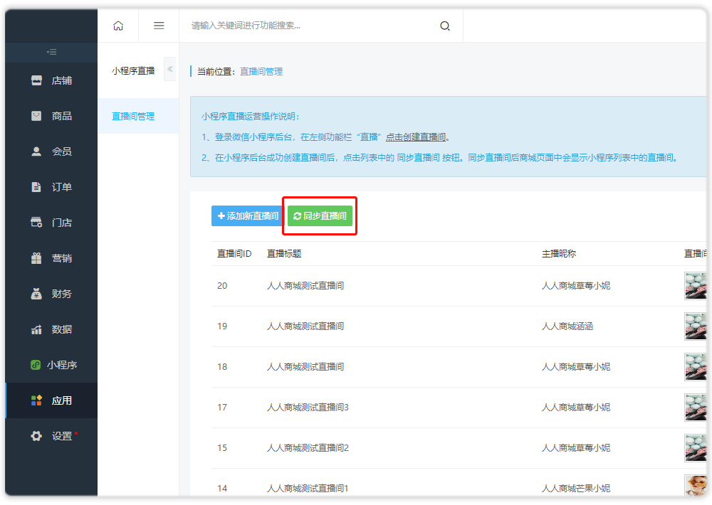 同步直播间:微信设置直播间后,点击管理后台“同步直播间”即可导入商城小程序直播列表页面。