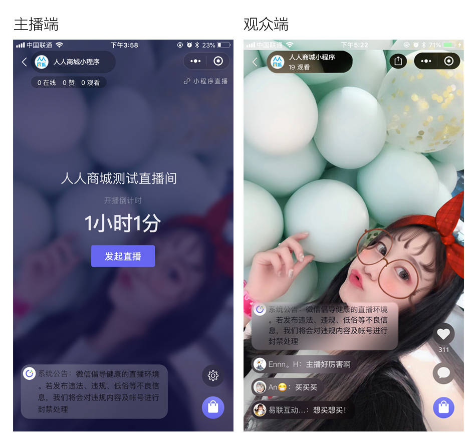 微信小程序直播包括观众端、主播端、微信后台管理端及人人商城管理后台。