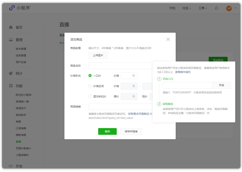 创建直播间:在微信MP后台按照页面要求填写直播间资料,主播微信号与实际开播主播一致即可。