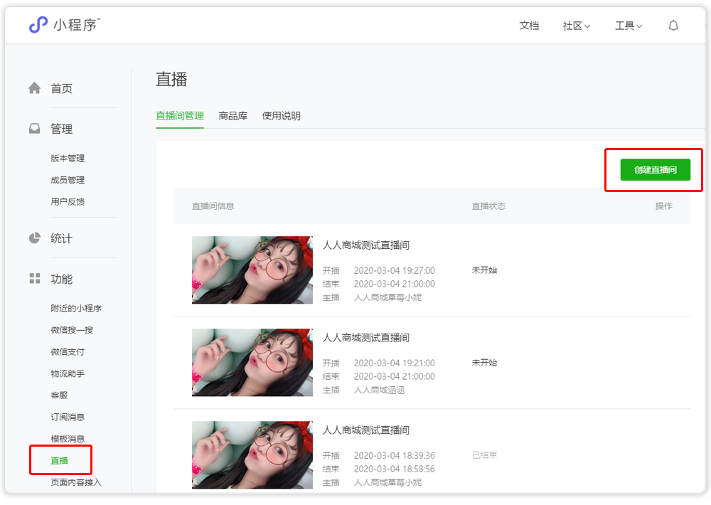 人人商城管理后台负责同步微信直播间及自定义装修小程序直播间入口。